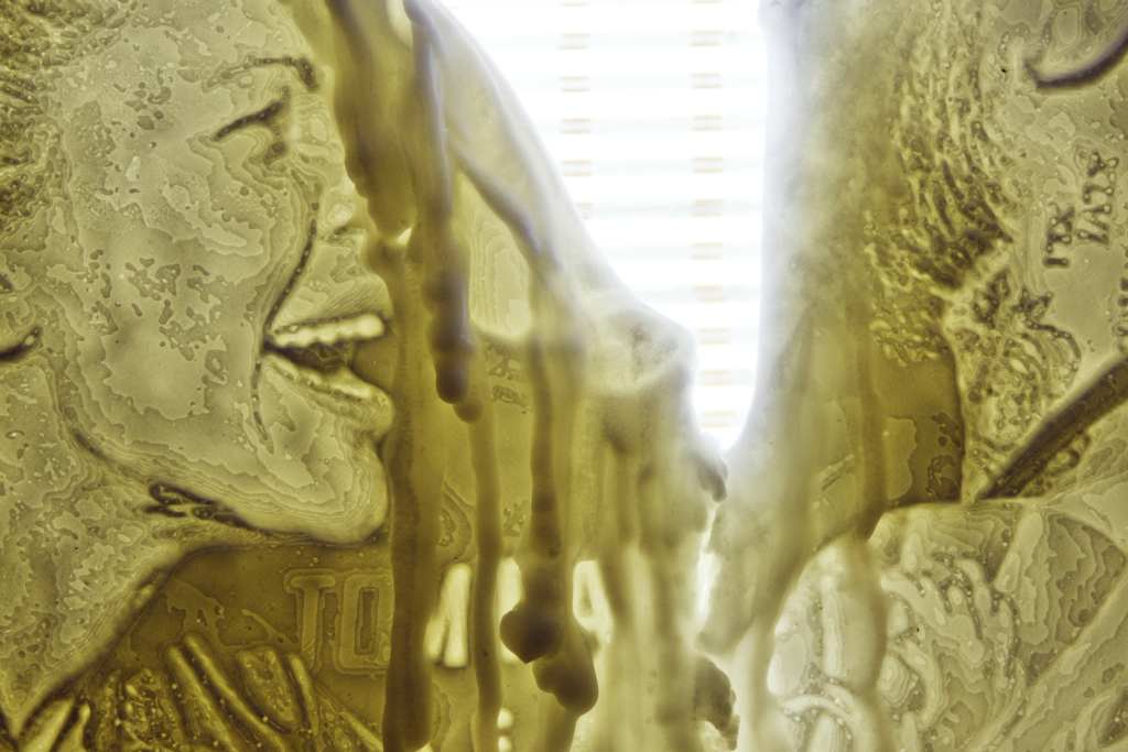 On y retrouve l’emploi du bismuth, du mastic et la Maïzena ou encore de la cire à cacheter. On y retrouve l’emploi des dessins sans ombre au style Pictionary qui ne se comprennent que dans le sens des flèches qu’ils laissent paraitre. Et puis celui du corps, le mien, reproduisant les techniques qui ont attrait à la performance en les détournant de leur but fondamental, la performance.